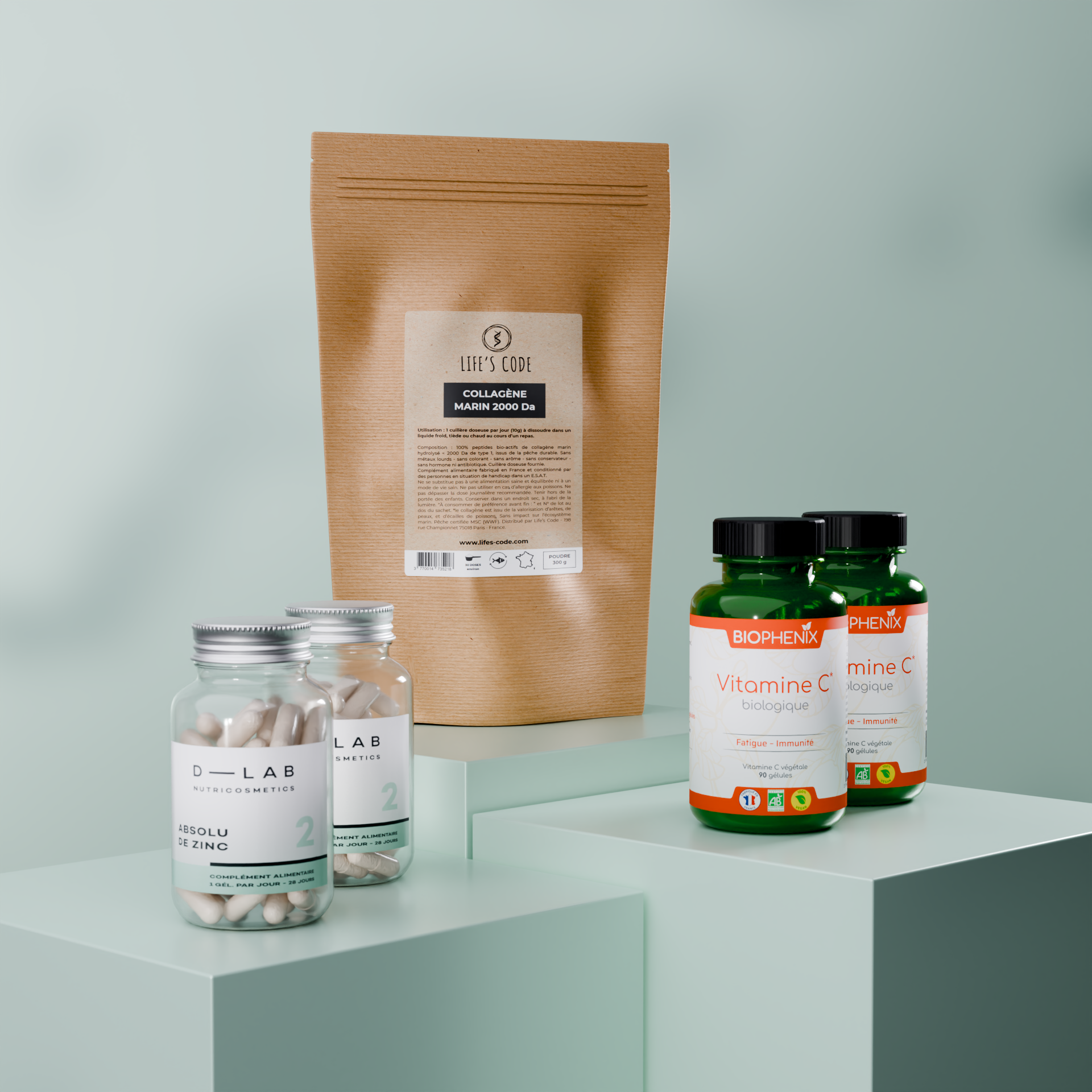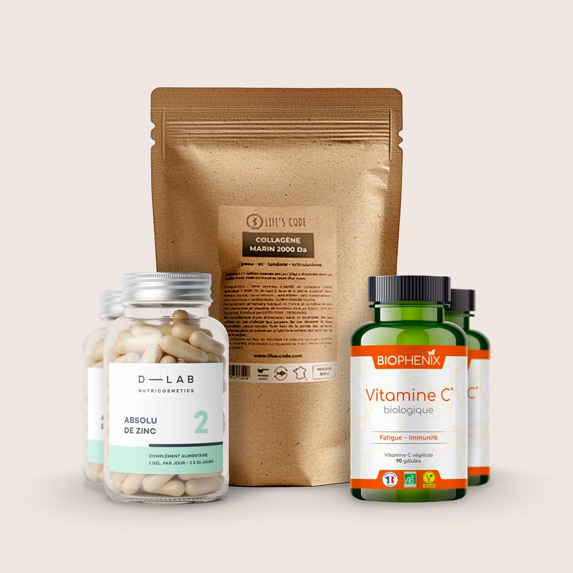 Le petit plus de ce pack, c'est la vitamine C ! Elle booste la production de collagène et renforce l'action antioxydante du zinc. Une vraie synergie pour nourrir votre peau !
