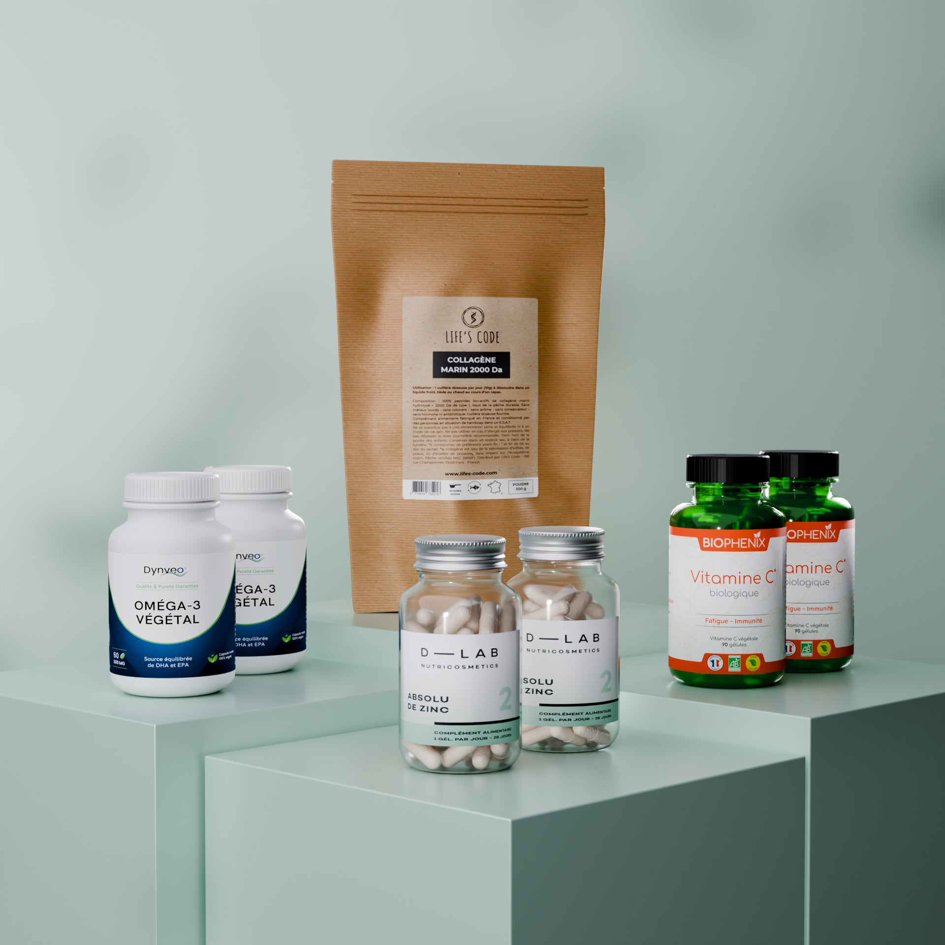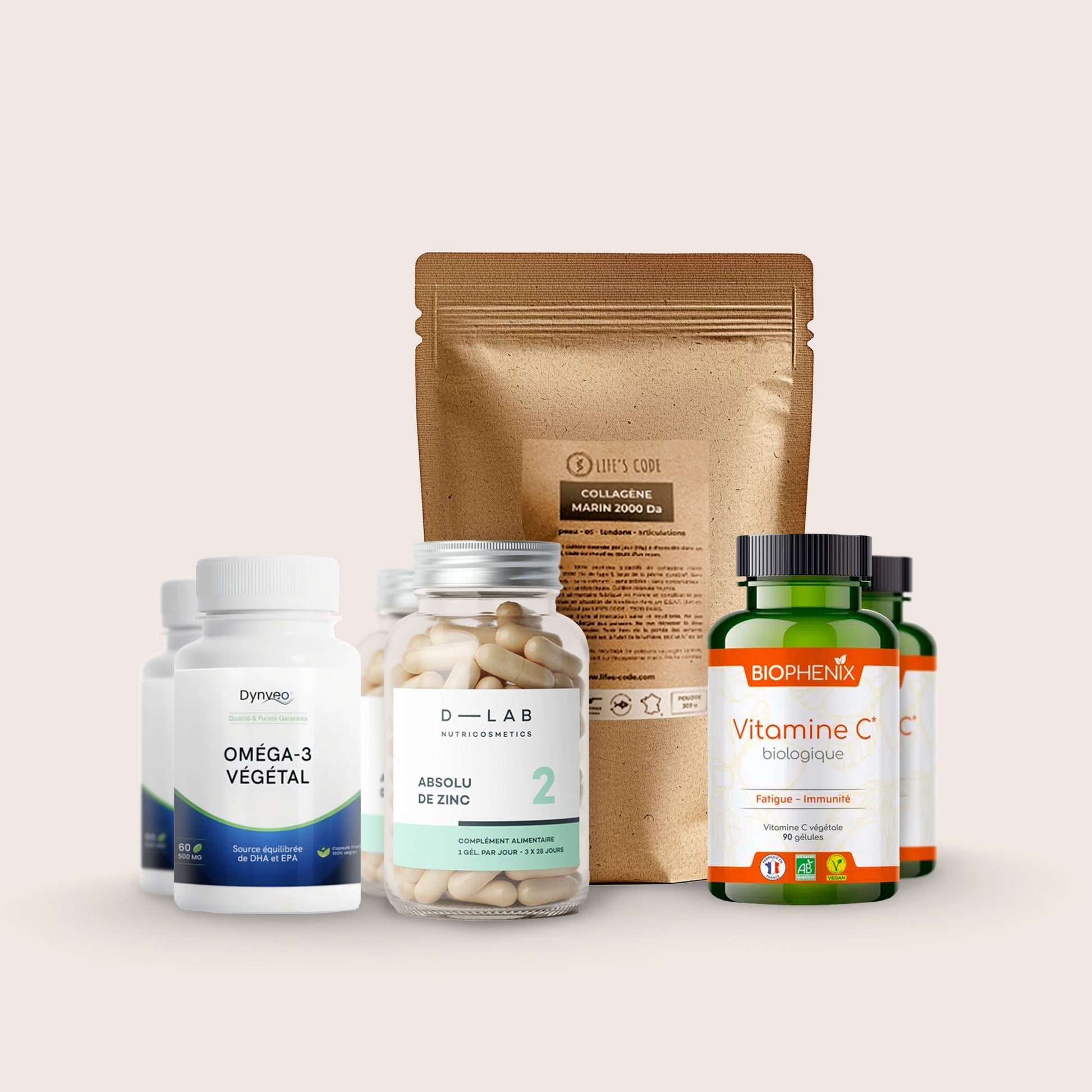 Une véritable action à 360° pour la santé de votre peau. Les bases d'une peau saine avec le collagène et le zinc, le boost anti-vieillissement avec la vitamine C, et l'hydratation en profondeur grâce aux oméga 3 qui viennent compléter ce pack.